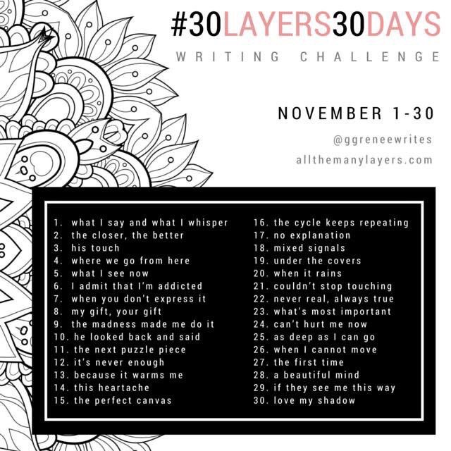 I’m late finding this and beginning, but below is the first post for @ggreenewrites #30Layers30Days Writing Challenge three minutes late. Better late than never! I’m excited to get started.